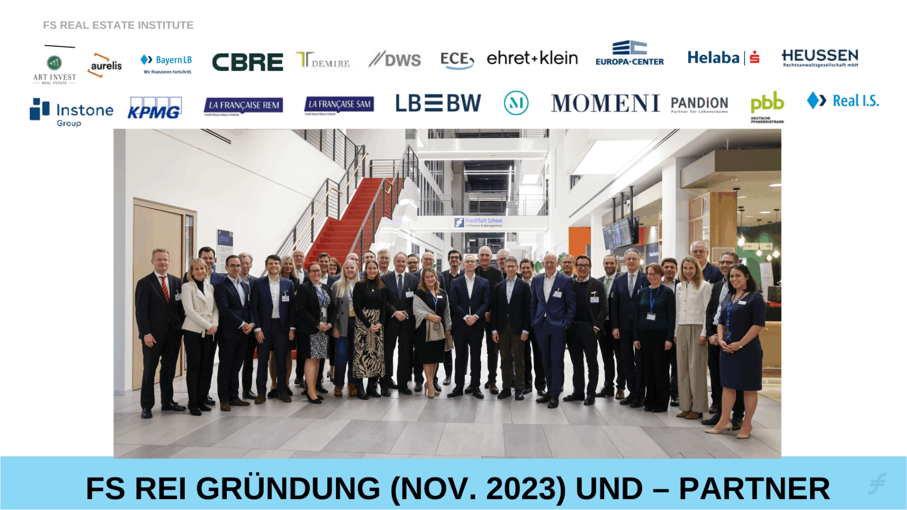 Ende November 2023 wurde das Frankfurt School Real Estate Institute (FS REI) unter Mitwirkung zahlreicher hochrangiger Vertreterinnen und Vertreter führender Unternehmen der Immobilien- und Finanzwirtschaft gegründet. Damit hat die FS ein neues Kompetenzzentrum zu Kernthemen der Immobilien- und Finanzwirtschaft. Das neu gegründete Institut wird maßgeblich unterstützt durch die Förderung von 21 Unternehmenspartnern.