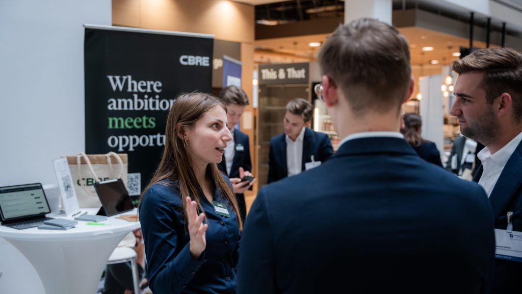 Der Real Estate Career Day bietet Studierenden eine einzigartige Gelegenheit, direkt mit führenden Unternehmen der Immobilien- und Finanzwirtschaft in Kontakt zu treten. Studierende erhalten Zugang zu spannenden Karrieremöglichkeiten (Praktikum, 3 Tage on the Job während des Studiums möglich, Einstiegsmöglichkeiten nach dem Studium) sowie Einblick in die Unternehmen. Sie etablieren persönliche Kontakte und bauen ihr Netzwerk auf!
